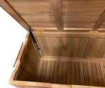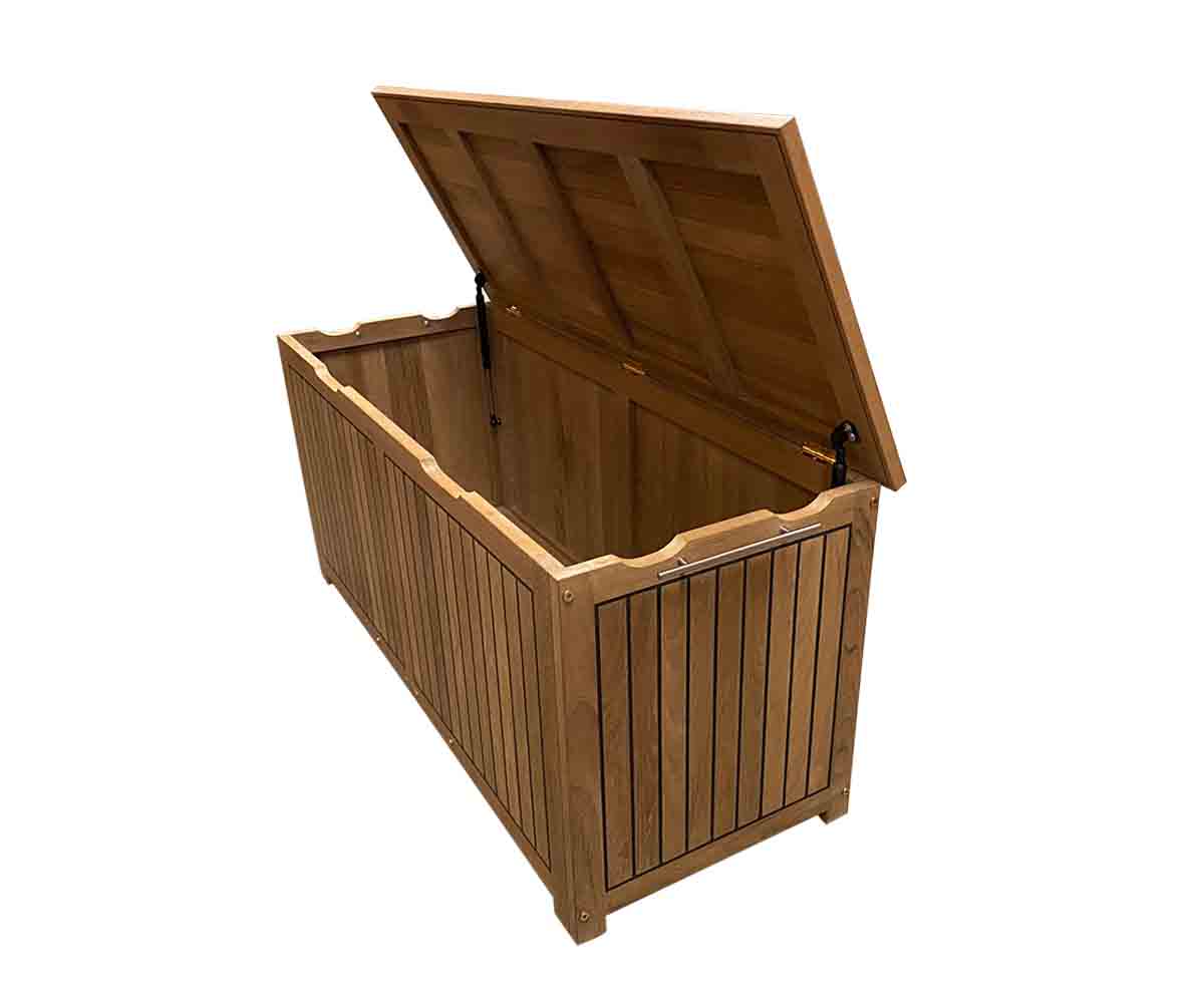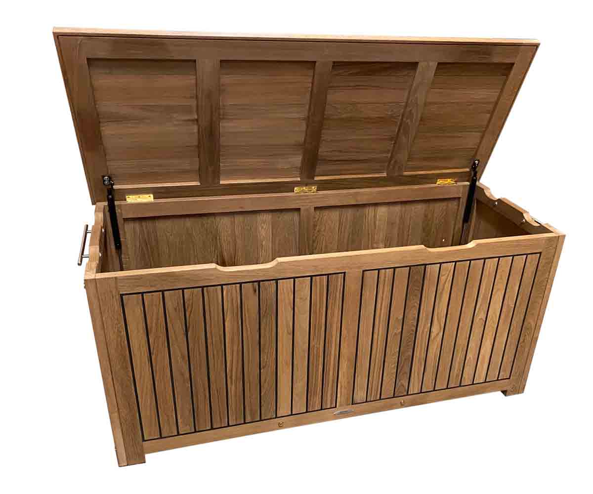 Our Carolina Teak storage box is great for storing your outdoor supplies, pool toys, chair cushions, etc. Hydraulic gas strut hinges keep the lid open. Grade A teak.