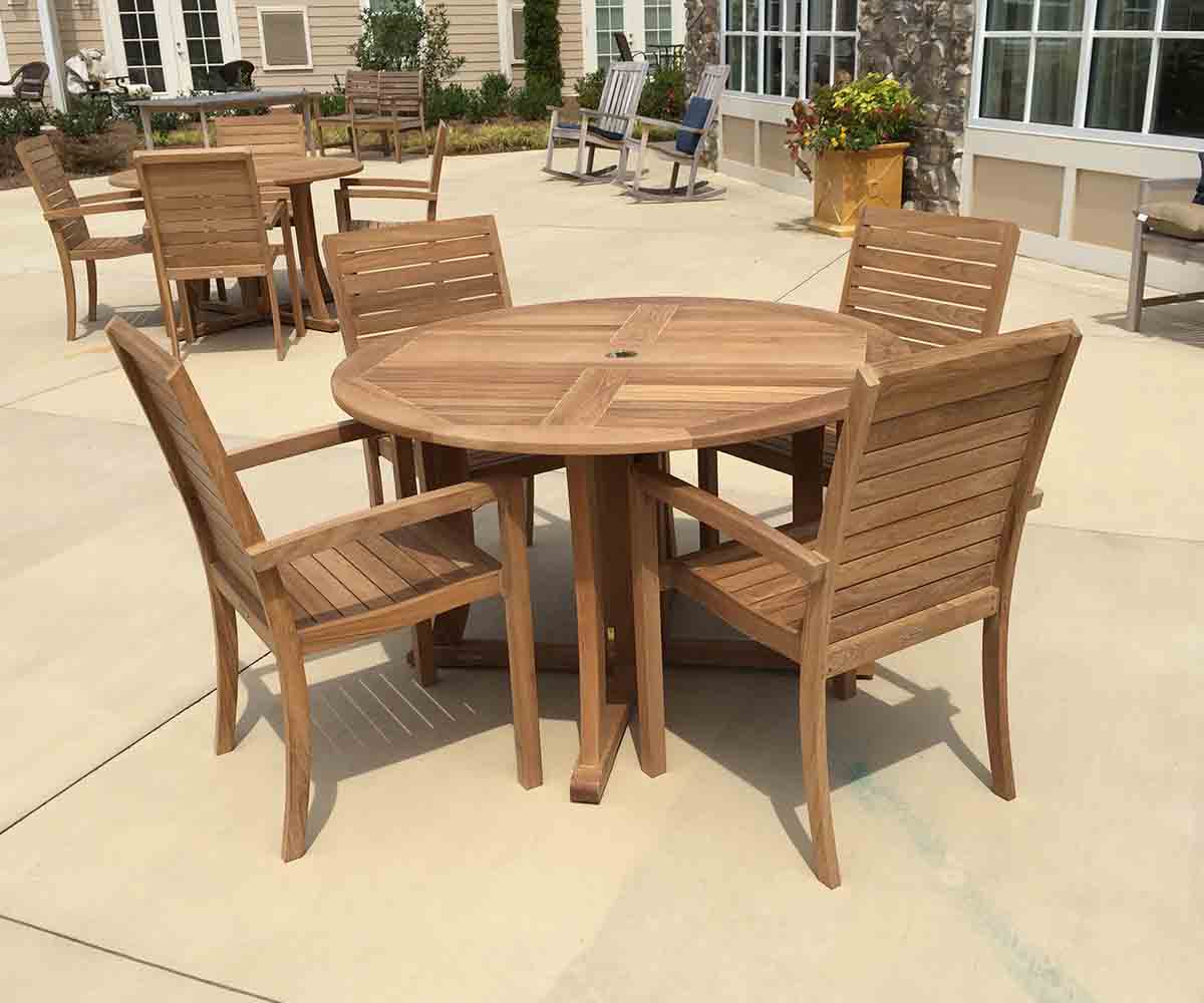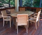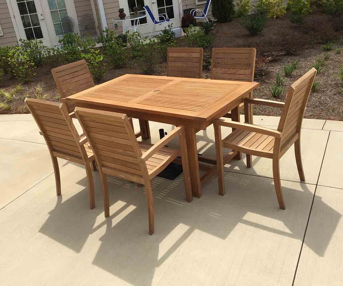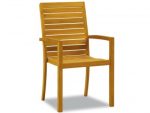 The medium width horizontal slats combined with the squared off arms and beveled top edge, our Tybee Stacking Arm Chair provides a more modern look on a traditional design. The front to back contoured seat provides a very comfortable resting spot. As an added convenience, these teak dining chairs are stackable, providing easy storage and space saving on your outdoor deck or patio. Used with a small café table or large teak extension table, these stacking chairs are a stylish option for any outdoor dining environment. 100% grade A teak from Thailand, mortise and tenon joinery, kiln dried to 8-12% moisture, these chairs are built to last.